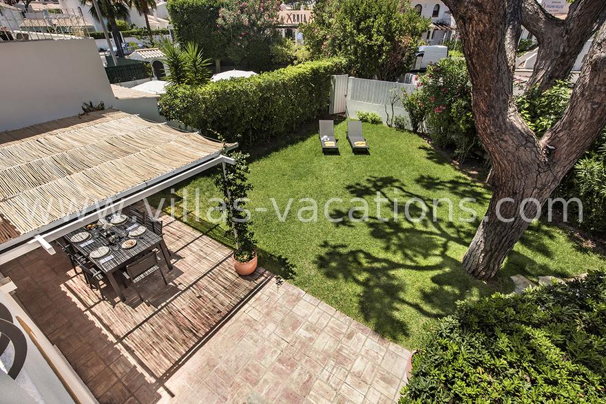 There is a gardened area with a shaded dining space, charcoal built-in BBQ and sunloungers.