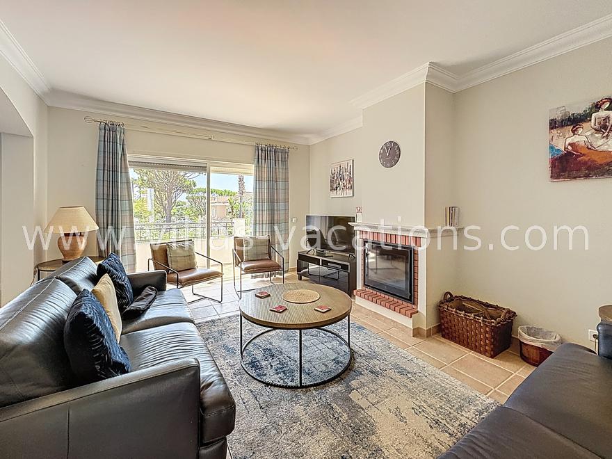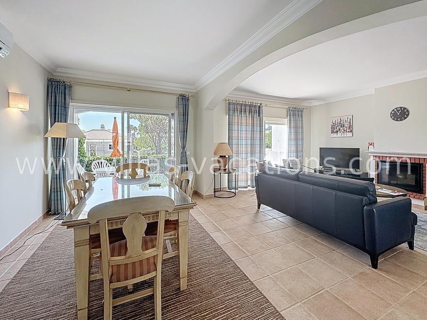 The entrance hall leads up to the fully equipped kitchen, which has everything you could ever need to make perfect memorable meals. Past the kitchen is a contemporary and bright lounge with comfortable sofas, a TV, a wood burning fireplace and patio doors leading out to the terrace that overlooks the pool area. Connected to the lounge is the dining area, which can accommodate up to 6 people.