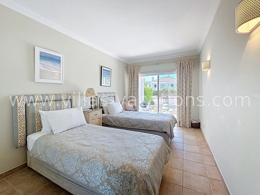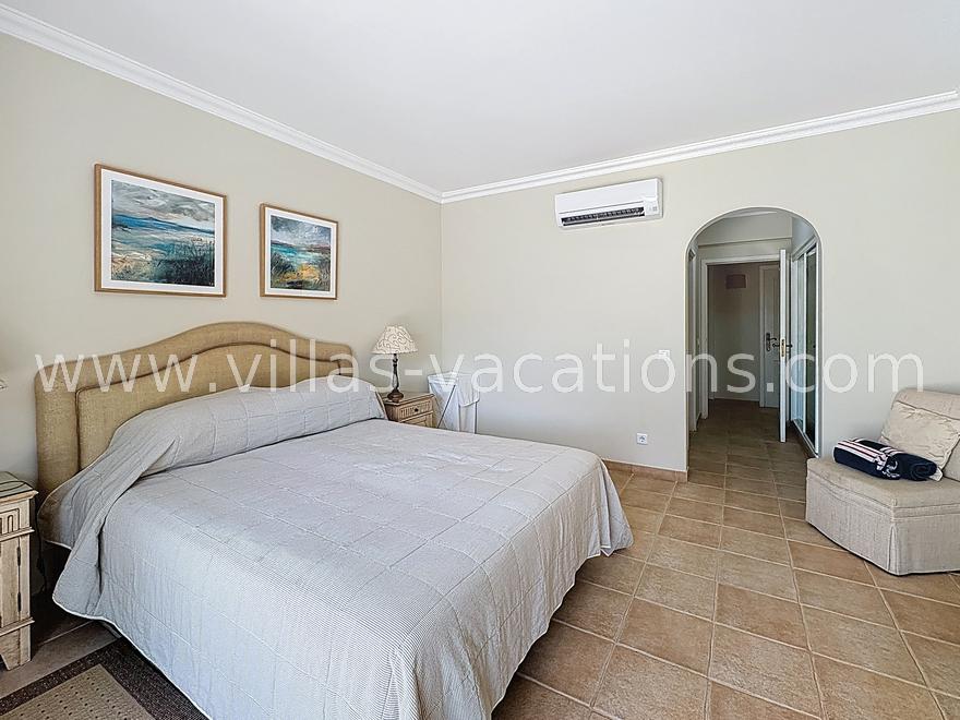 The master suite with a large double bed, fitted wardrobes, an ensuite bathroom and patio doors to the pool area.