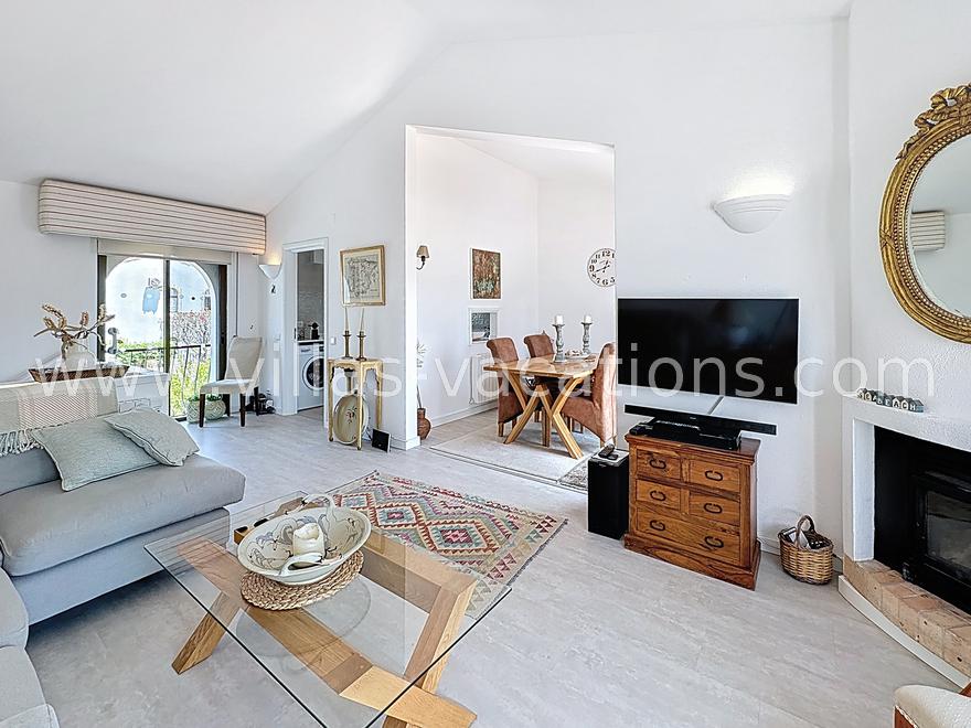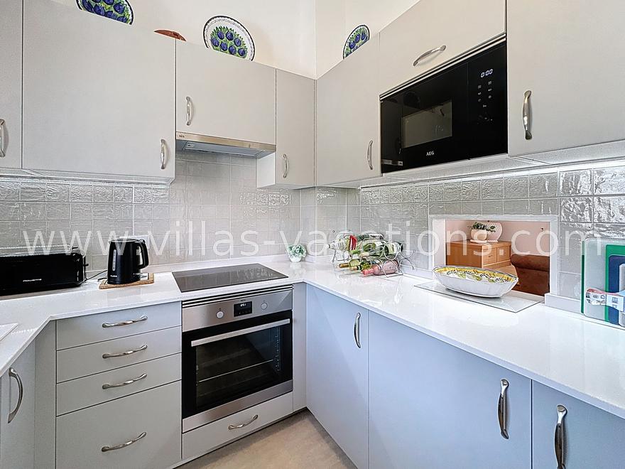 First-floor comfortable and spacious lounge/dining room with wood burning stove, and patio doors to a sun terrace with electric awning and steps leading down to the pool and garden. Compact modern kitchen with serving hatch to dining area.