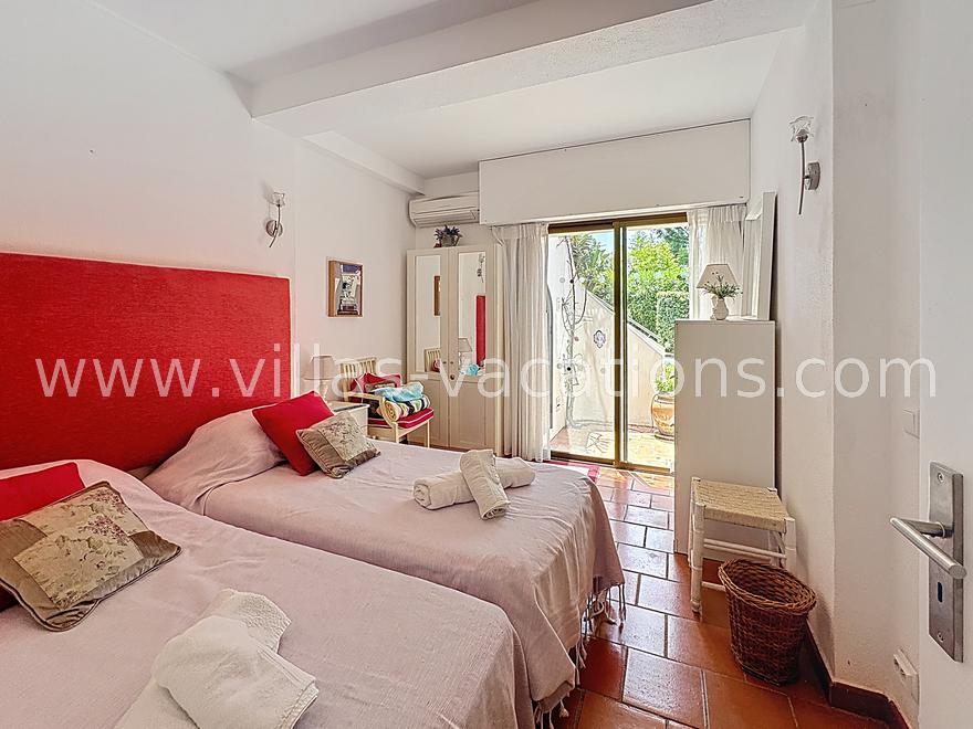 Set in a small garden courtyard. Entrance hall with stairs up to the first floor, access to ground floor bedrooms and storage area under the stairs. Additional large storage area with a window on the ground floor, currently used as an office. Master bedroom with fitted wardrobes with large sliding doors and a patio window leading to pool terrace & modern en-suite shower room. On the same level second bedroom with, patio doors and separate shower room. Both bedrooms have electric shutters and air-conditioning.